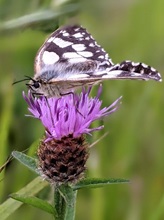 Marbled white butterfly (Melanargia galathea) feeding on knapweed a common chalk grassland species.